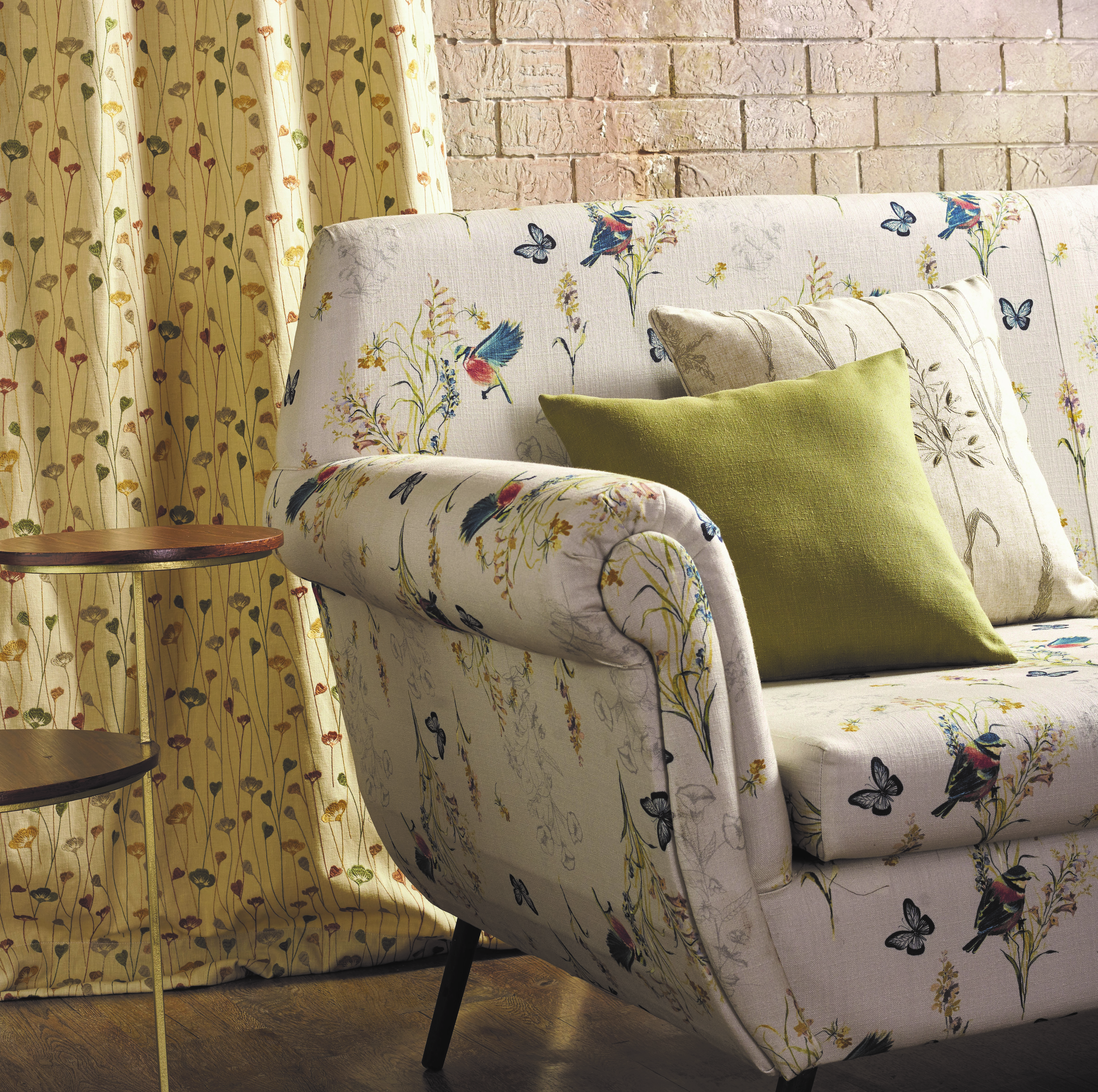 True classic character comes to life with back pleated rolled arms and warm brown exposed frame with bun feet are beautifully traditional. Lovely detailing carries itself through the weave in the soft upholstery. Seat cushions reverse to maintain durable comfort. Vintage-inspired jumbo nailhead trim graces the design. Plaid and botanical pillows in dark brown are a timeless touch.